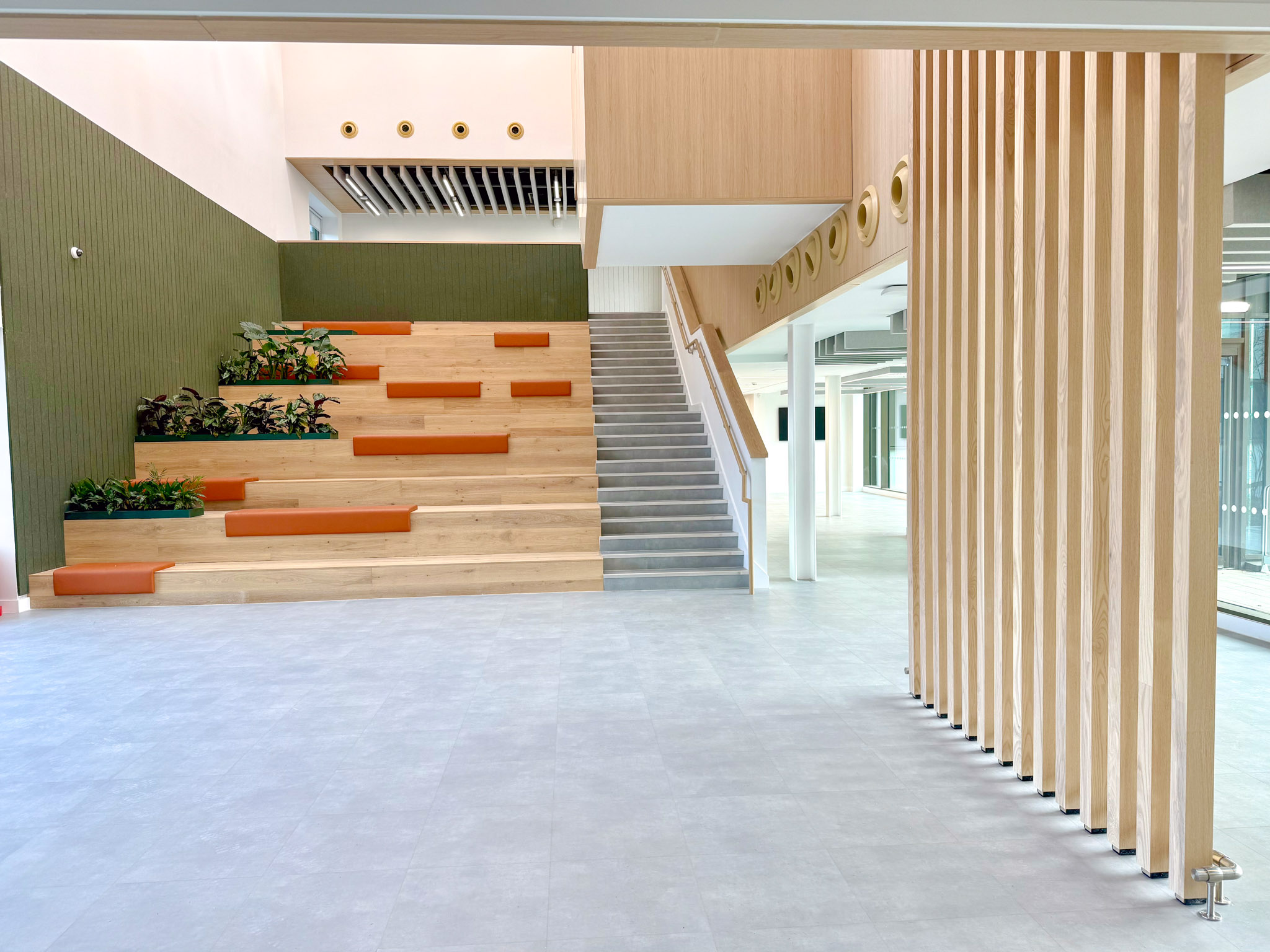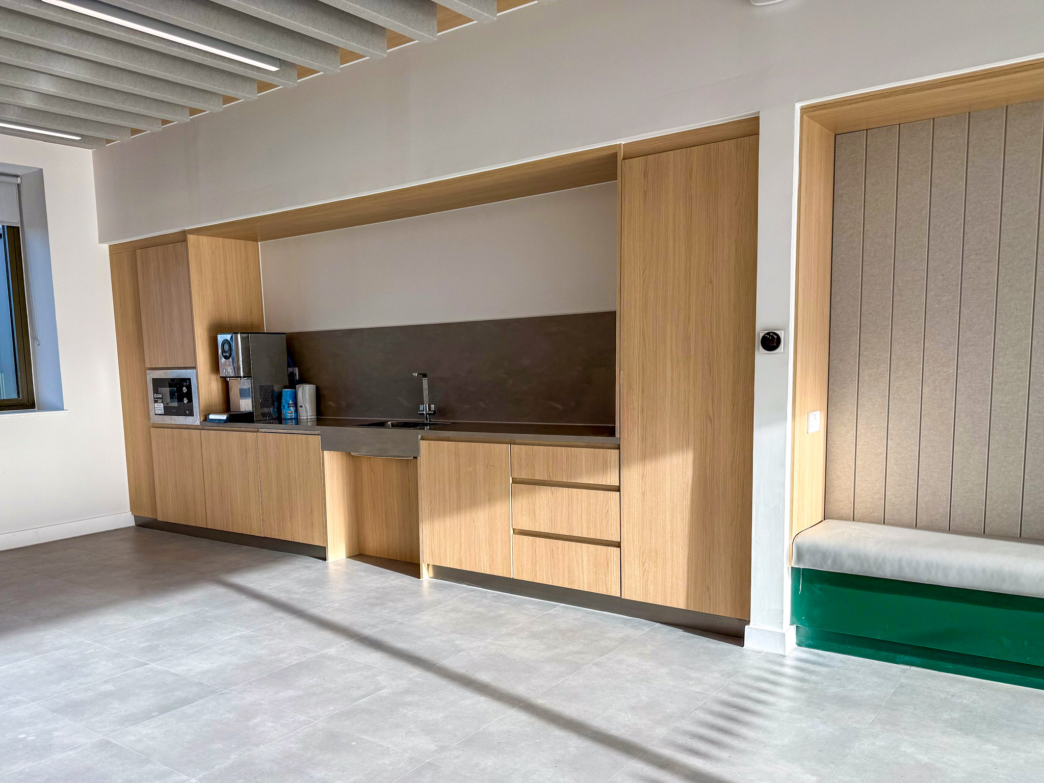 Another project involved supplying and fitting bespoke furniture for the Edinburgh Innovation Hub, the newest facility at Queen Margaret University. For this development, we crafted a reception desk, tea prep areas, booth seating, atrium seating, and ash fins.